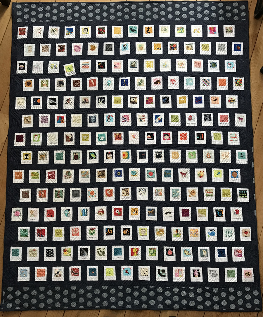 While it’s obvious I haven’t been busy writing blog posts, know that I have been busy sewing. In fact, I recently finished one of the most time-intensive quilts I’ve made. It all started last summer when one of the guild members in my Bee Hive swap asked us to make Polaroid blocks for her. Basically, they’re little blocks with a fussy-cut image surrounded by white borders to make it look like an old Polaroid photo.