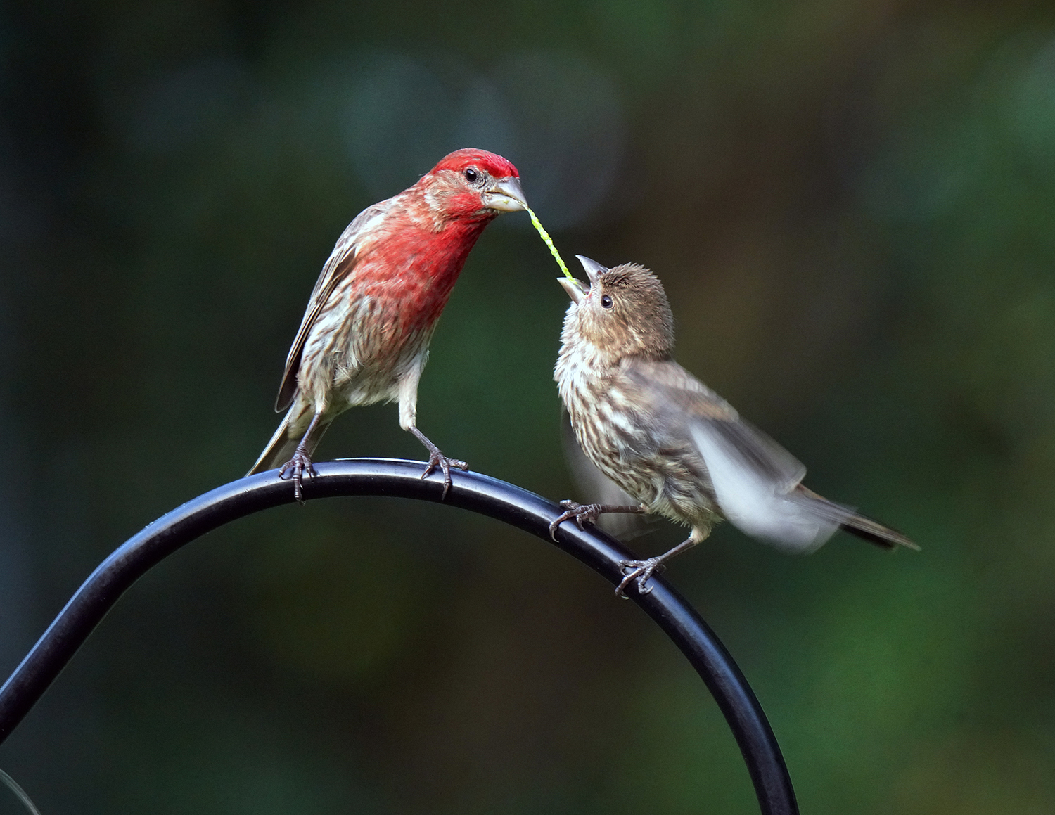 A male House finch (Haemorhous mexicanus) feeds a caterpillar to a fledgling. The juvenile is flapping its wings to signal that it wants to be fed.