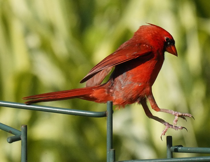 Male Northern cardinal (Cardinalis cardinalis) hopping to a better perching spot as other birds mob the feeders.