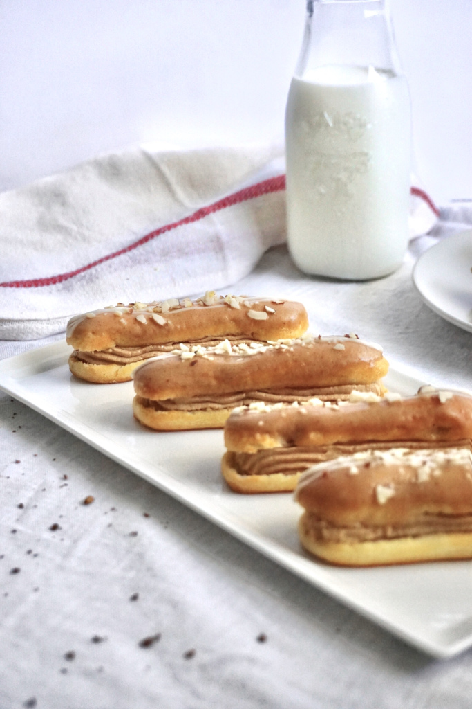 Coffee + choux pastry is an addicting combination that many people will love! These coffee eclairs have a crisp exterior, a coffee-flavored cream, and a coffee glaze, all topped with a white chocolate drizzle and chopped almonds. It sounds rather sweet, but isn’t since choux pastry is not sweet at all. While the eclairs are decadent, they taste light and are perfect for breakfast or dessert.