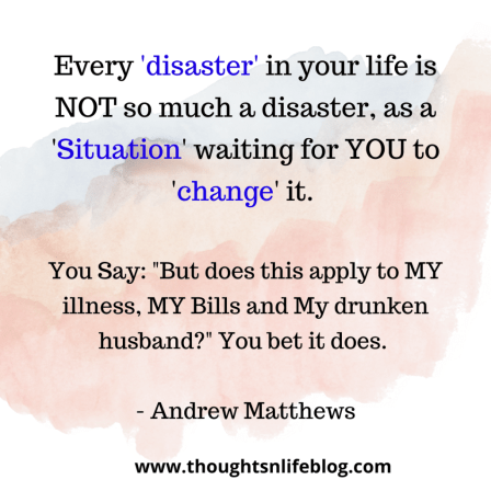 Every ‘disaster’ in your life is NOT so much a disaster, as a ‘Situation’ waiting for YOU to ‘change’ it. You Say: “But does this apply to MY illness, MY Bills and My drunken husband?” You bet it does. – Andrew Matthews