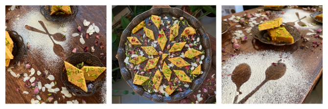 Here is a really simple sweet sugarfree “besan barfi” for those who are concerned about their sweet tooth, besan is a great option for diabetics andhose watching their sugar levels. Barfi is the term used in the subcontinent for a sweet fudge and it can be made with anything from lentils to nuts, fruits and in this case from besan (gram flour), ghee, stevia; flavored with saffron and cardamom.