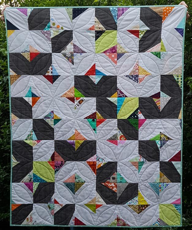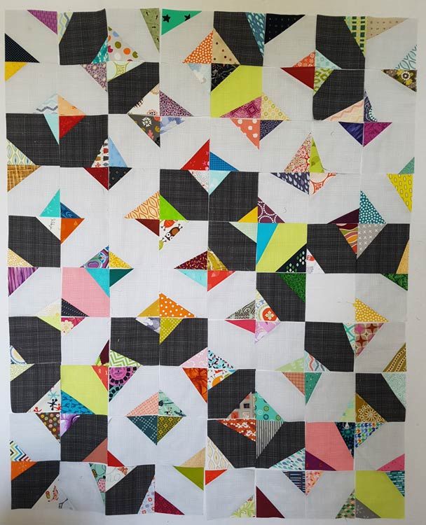 I started with the light grey background and used scraps for the triangles. When I ran out of the light grey I added the black and at some point also started to cut triangles from yardage, fat quarters and layer cakes because I wanted a different fabric for each triangle and not all of my scraps were large enough anymore. I even unpicked a couple of squares when I realised I had duplicates. When I ran out of black background I switched to neon green. I also made some pink squares but liked the overall look better without the pink. The blocks finish at…