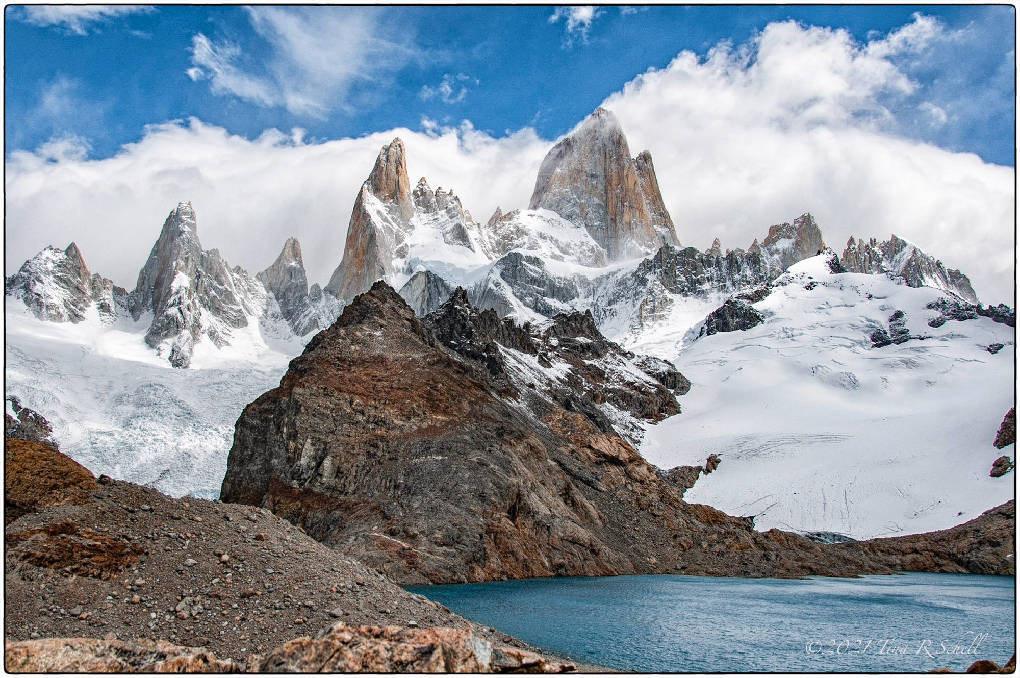 This week our guest host Dianne has asked us to share some examples of the wild places we’ve seen, “Mother Nature untouched and untrammelled”. I’ve opened above and below with some majestic mountain views of Patagonia. There, some of the most beautiful, rugged mountains in the world can be see in both Chile and Argentina.My header this week is also from that trip, a vista of the Andes that illustrates the immensity of the mountain peaks when compared with the structures below.