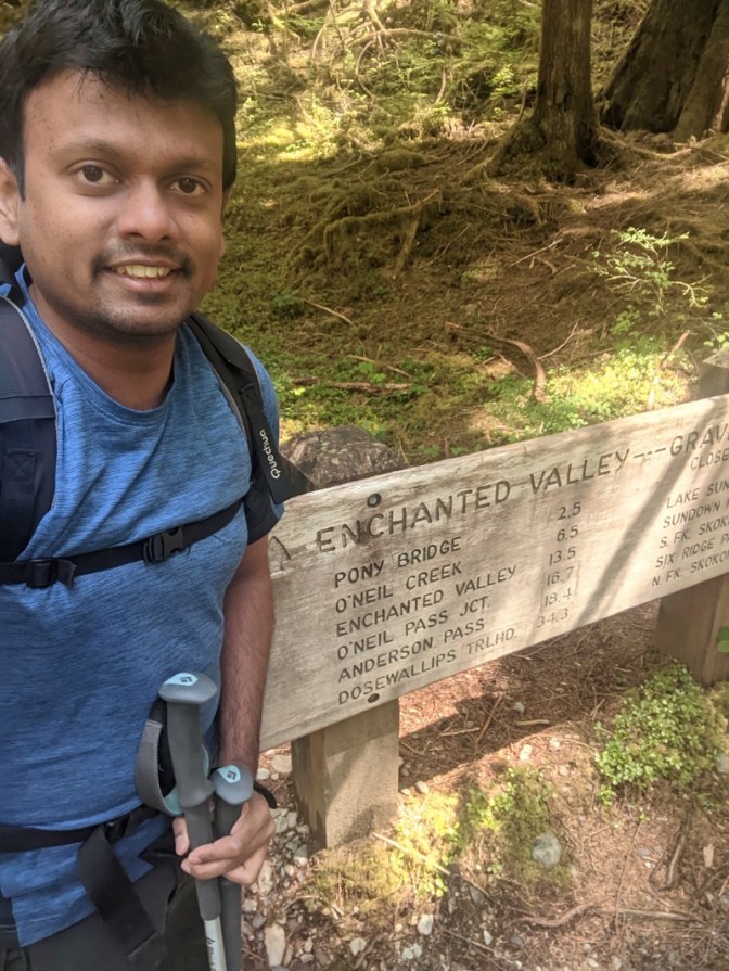 After 3+ hours drive, we reached the Graves creek trailhead and got ready with our packs and poles by 1 PM. Our plan on day 1 was to hike 13.5 miles to Enchanted valley campsite…