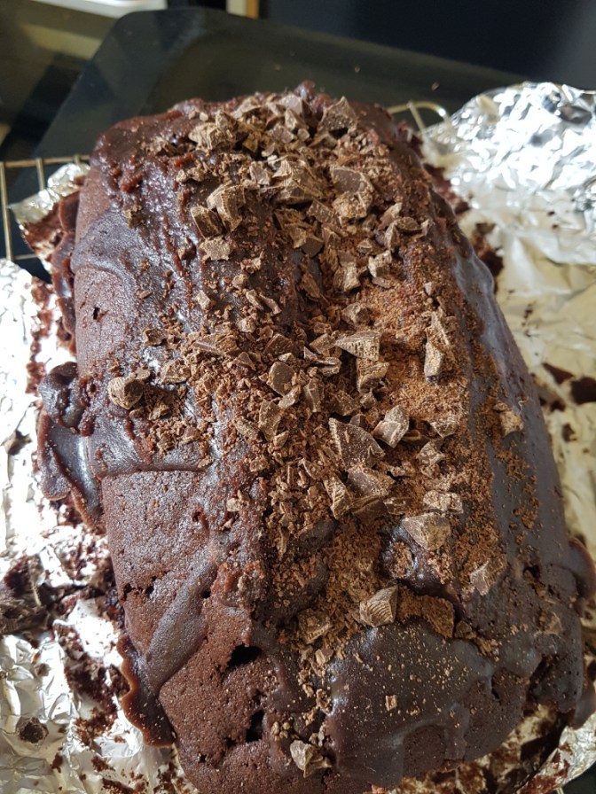 As you might imagine there are 4 chocolate elements that make up this cake. Rich chocolate sponge studded with chocolate chips, then a lush chocolate syrup that covers the cake then chocolate shavings to cover that. Sure why not?