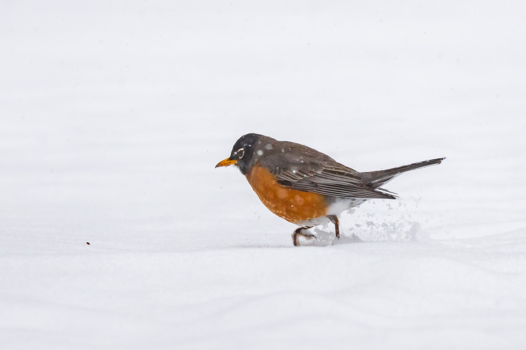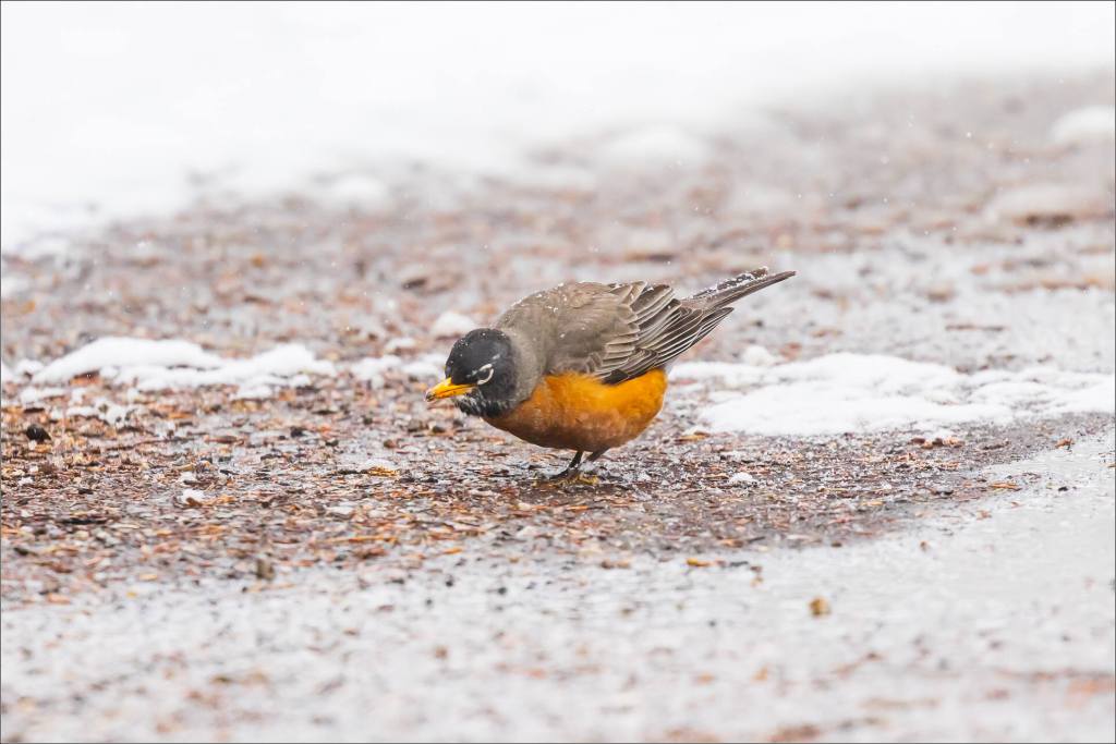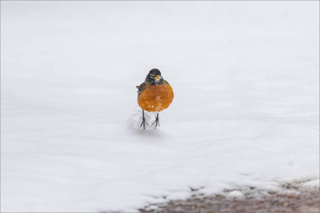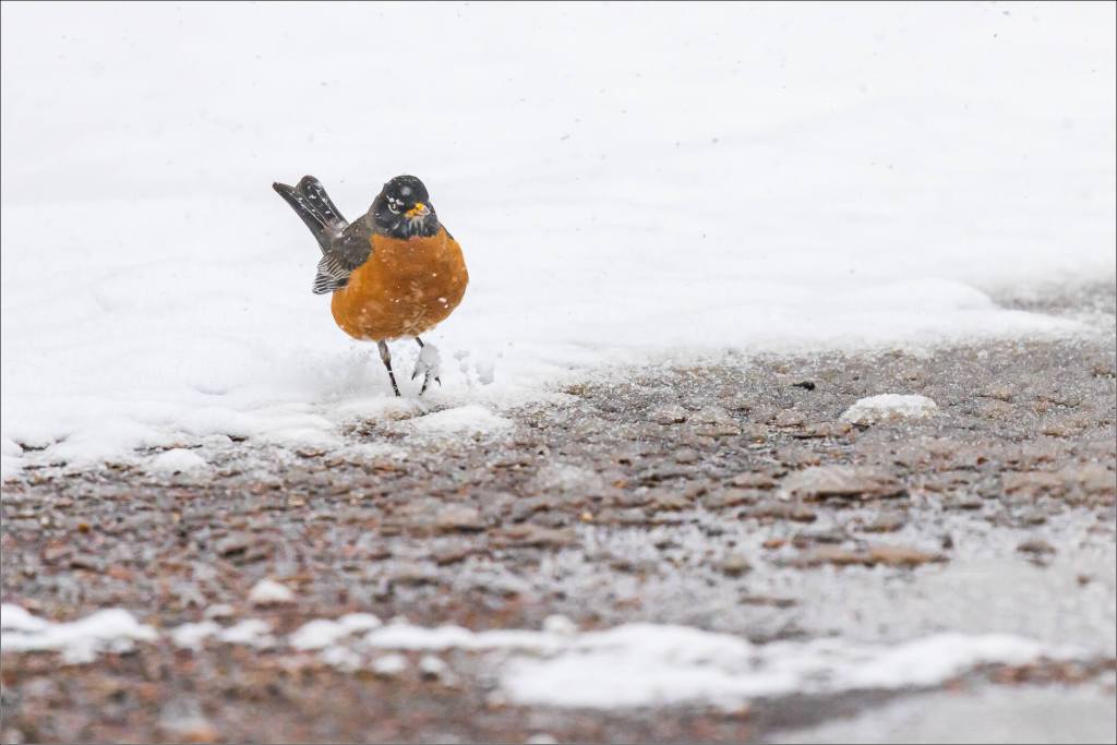 In mid-April, snow fell regularly. The robins had arrived earlier in the month and I wasn’t sure how they would feel about the weather. One afternoon, I photographed this one for a little while. He didn’t seem to have any issues with the white stuff as he bombed through it and flew around to a few different spots around the yard.