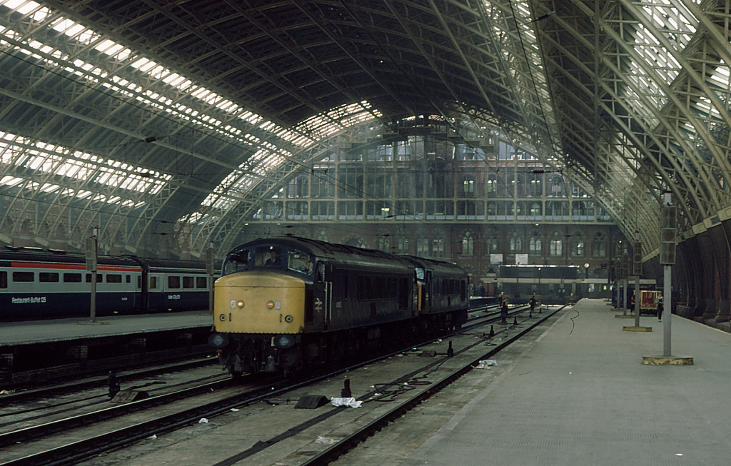 …It’s certainly worth stopping to take a look at Barlow’s magnificent trainshed. It was refurbished as part of the rebuilding of St.Pancras station for international services through the channel tunnel, which completed in 2007. Included in the rebuild was restoration of the clock, which had been absent for many years. Here’s a shot showing more of Barlow’s trainshed as it was in the 1980’s…