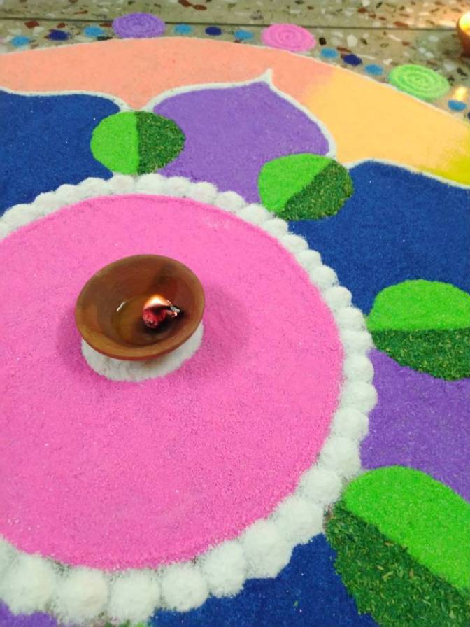 Rangoli is a traditional Indian art form, existing in various forms and under myriad names all over the country–from Kerala’s Pookalam made with flowers on the festival of Onam, to North India’s vibrant Rangolis (made with colourful sand) seen in every household that celebrates the festival of Diwali.