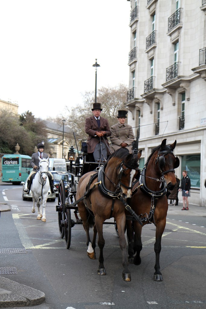 Here are a pair of horses with a carriage accompanied by an outrider on Buckingham Gate…