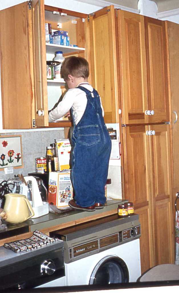 The words have disappeared, but we still have a few photos from this time. One of my favorites was John $pencer taking things out of the cabinet. He got there on his own, perhaps by climbing on a toy. I wrote on the slide, “TROUBLE at work”.