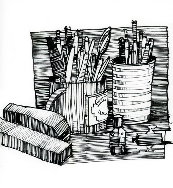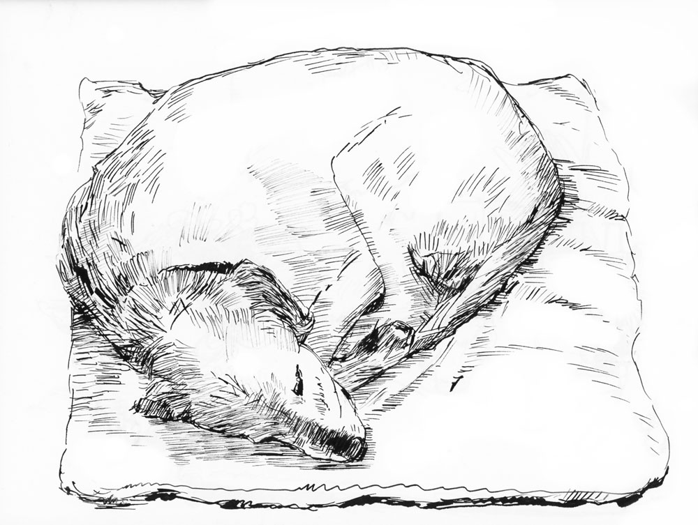 During my Zoom call with Suhita this week, I did a sort of mindless drawing with my Kakimori brass nib dip pen while we chatted. Turns out Suhita was drawing with the same pen. I hadn’t really planned what I was going to draw during our call, but that pen, a sketchbook, and a bottle of ink, are always on my desk. They’re there in case I catch Alice in a good pose after a walk, or if I am on endless hold with tech support for something or other (usually the phone company!), or if I just need to take a break from doing stuff on my computer for a bit.